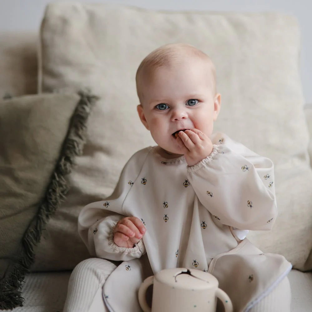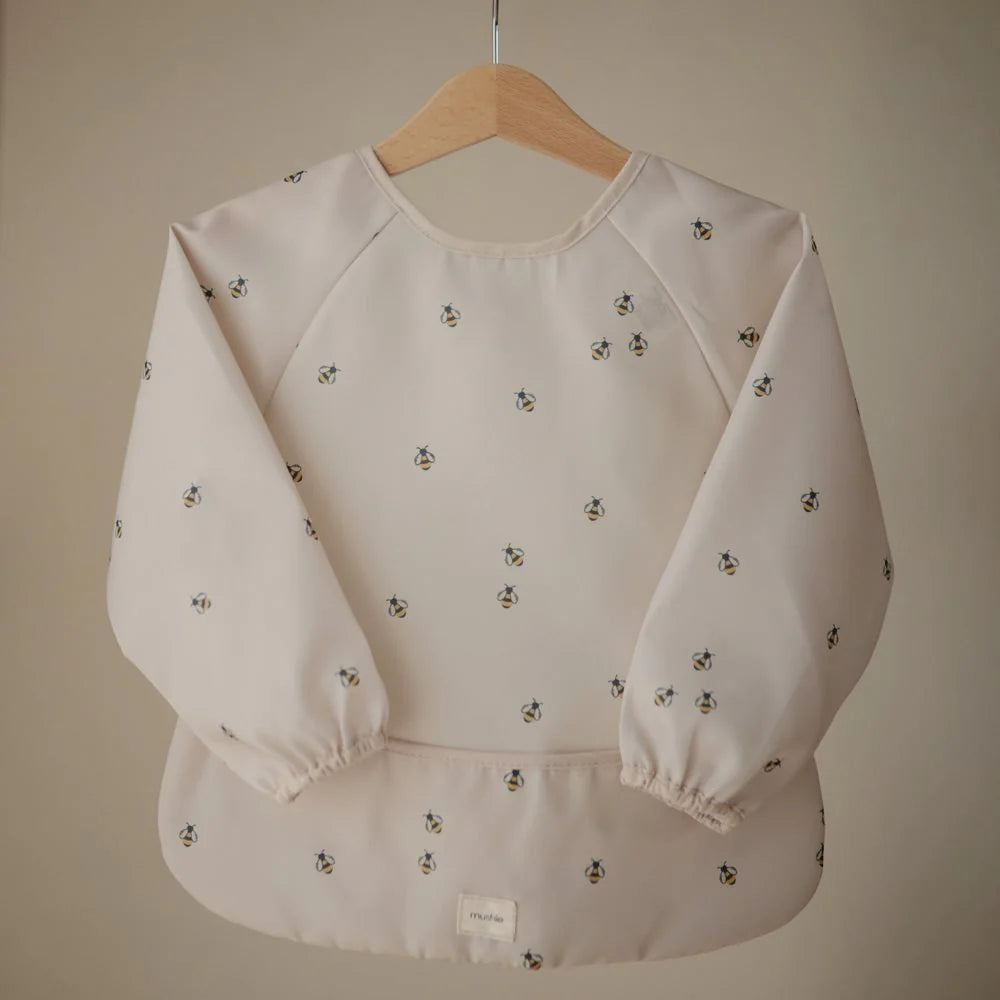 Keep the kids clean at mealtimes and art projects with the Mushie water-resistant Long-sleeve Bib Olive Checkers. Its wide pocket easily catches food while the bib stays secure and fully covers outfits. With a velcro closure at the back of the neck, it's perfectly sized for littles between 6 and 24 months. Parents appreciate the wipe-clean material that's also safe for washing machines so you can embrace the day without clothing stains.